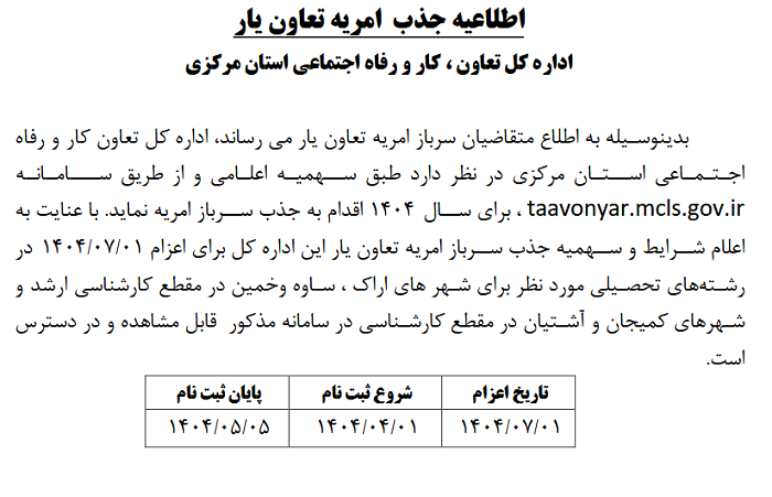 اطلاعیه جذب امریه تعاون یار ۱۱ تیر ۱۴۰۴ | ۱۲:۰۴ کد : ۵۲۷۴۸ اطلاعیه ارسال به دیگران نام شما ایمیل شما ایمیل دریافتکننده ارسال انصراف تعداد بازدید:۱۲۵۴ اطلاعیه جذب امریه تعاون یار