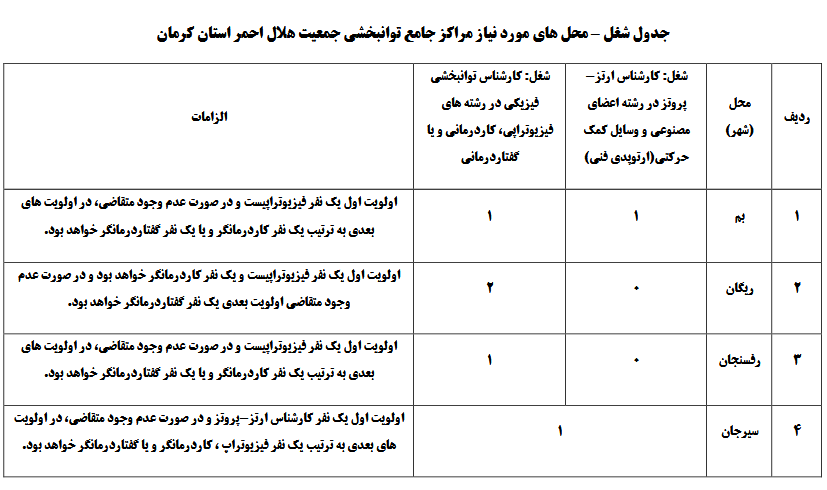 به اطلاع می رساند، جمعیت هلال احمر کشور به منظور تأمین نیروی انسانی تخصصی مورد نیاز مراکز توانبخشی فعال خود در سطح استان کرمان، اقدام به استخدام نیرو در رشته محل های مورد نیاز برای مشاغل ذکر شده در جدول ذیل  می نماید.فایل متن فراخوان جذب کارشناسان توانبخشی به پیوست می باشد.