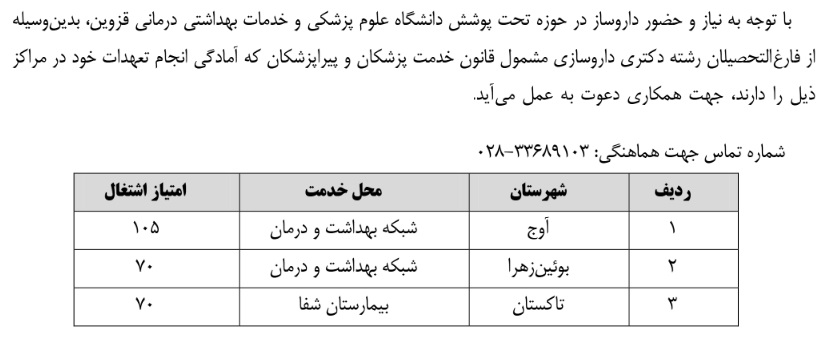 جذب نیروی داروساز مشمول قانون خدمت ۲۵ آذر ۱۴۰۴ | ۰۹:۰۰ کد : ۵۷۰۵۷ اطلاعیه ارسال به دیگران نام شما ایمیل شما ایمیل دریافتکننده ارسال انصراف تعداد بازدید:۴۹۳ جذب نیروی داروساز مشمول قانون خدمت در دانشگاه علوم پزشکی قزوین